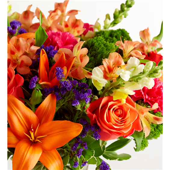 Putting a bright start in somebody’s day starts with a beautiful gift. Our delightfully vibrant bouquet is filled with a medley of blooms in cheerful pops of orange, hot pink and yellow, with plenty of lush greenery mixed in. Designed by the talented Breanna Cartwright from Fresh Ideas Flowers Company in Modesto, California, it’s the perfect pick-me-up surprise, whatever the sentiment.